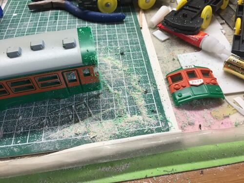 昨日は恐ろしいほど暑かったのに今日は雨… 大人しくブログ更新します() まずは1両中間車化させる必要がありましたので 首 チ ョ ン パ ★ しました♨ 新たにプラ板で妻板を再現 次にプラ板+パテ粉末、瞬間接着剤で窓を埋めました その他繋ぎ目部分にもパテ粉末…